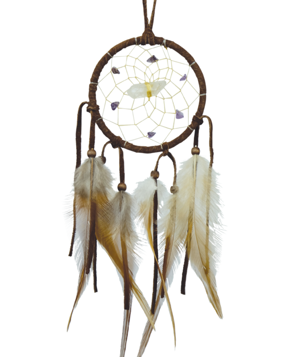 3" Brown Vision Seeker Dream Catchers are detailed with a quartz crystal in the middle of the web and adorned with semi-precious stones....Read more