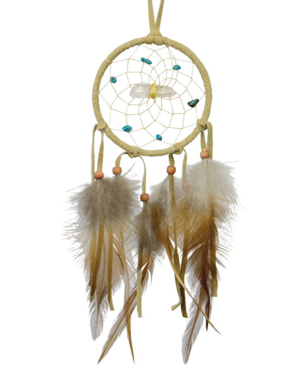 3" Tan Vision Seeker Dream Catchers are detailed with a quartz crystal in the middle of the web and adorned with semi-precious stones. The quartz crystal assists in removing negative thoughts while the semi-precious stones enhance spiritual communications and guidance.