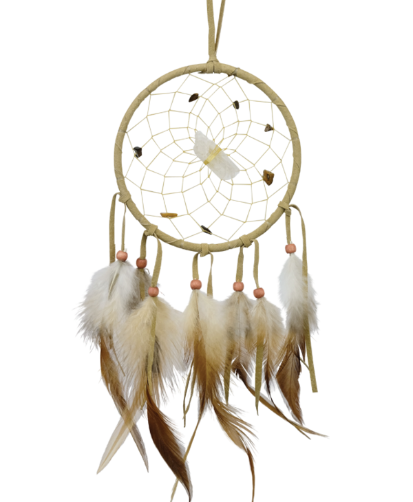 4" Tan Vision Seeker Dream Catcher detailed with quartz crystal in the centre of the web. Semi-precious stones will vary.