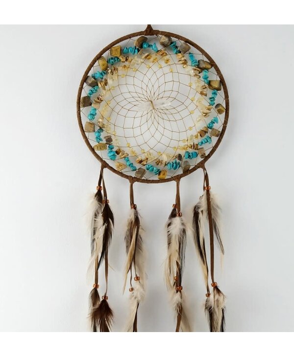 6" Brown Vision Seeker Cluster Dream Catcher. Detailed with tiger eye, turquoise, citrine and picture jasper semi-precious stones and a quartz crystal in the centre. Handcrafted in Canada