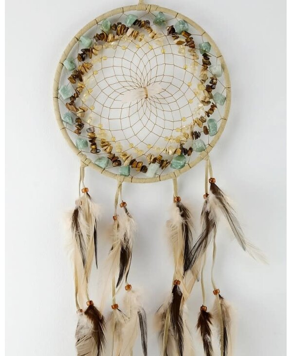 6" Tan Vision Seeker Cluster Dream Catcher. Detailed with tiger eye, aventurine, citrine and picture jasper semi-precious stones and a quartz crystal in the centre. Handcrafted in Canada