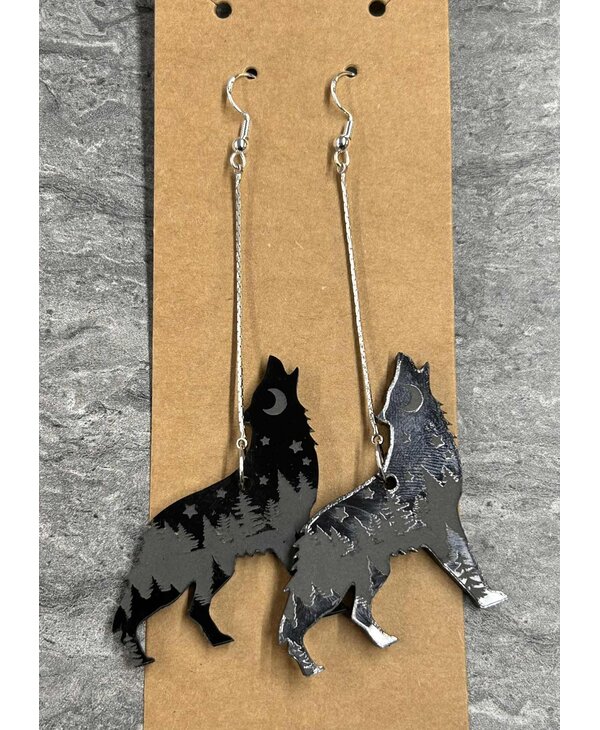 Acrylic Wolf with engraving earrings by Stacey Smith