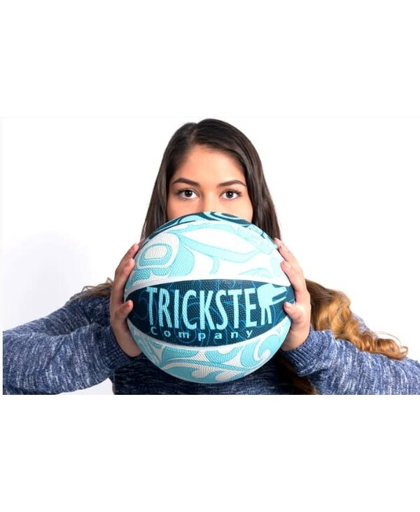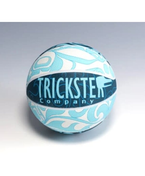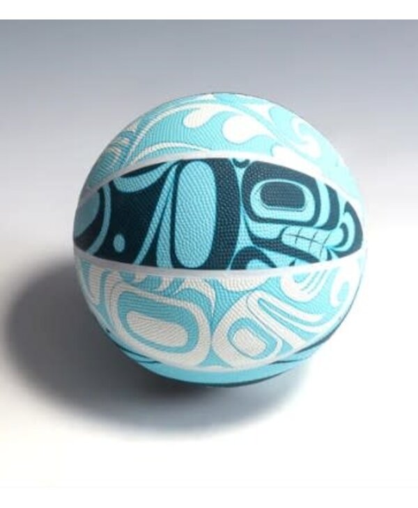 The women's basketball design reflects the relationship the water and moon share. The blue color tones are inspired by Mendenhall glacial caves in Juneau, Alaska. One panel there is the crescent moon and two stars. The other panels have sea life and animals. Water is life.