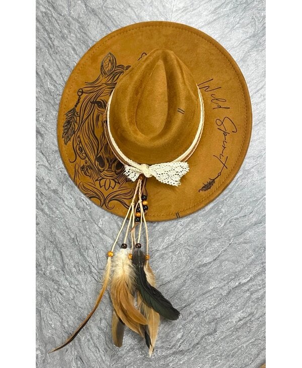 Felt Hat with design burn by Stacey Smith - Horse w feather hat band brown