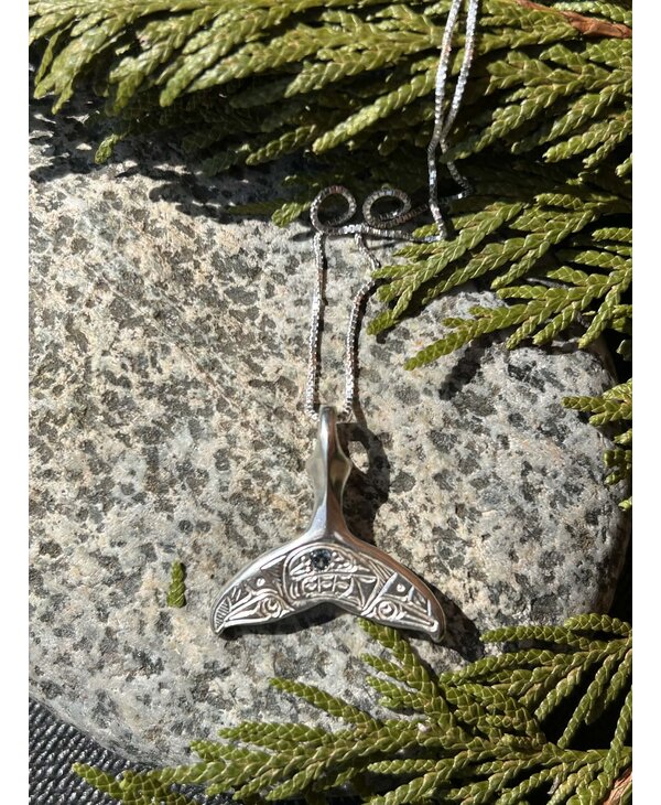 Hand Carved Silver Whale Tail Pendant w Eagle & Emerald Gem by Richard Lang - Stó∶lō Gift Shop
