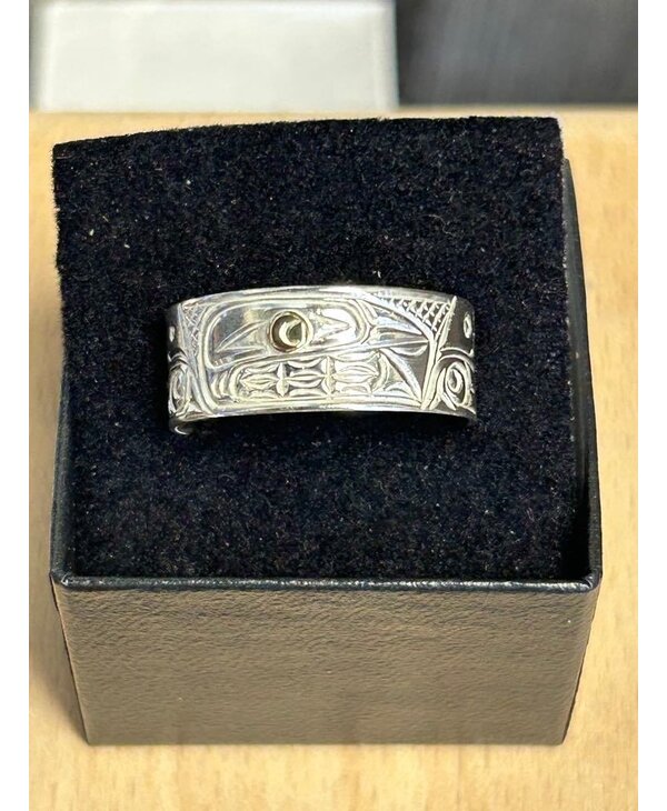 Hand Carved Silver Ring Solid Band with Gold eye s13.5 Orca by Richard Lang - Stó∶lō Gift Shop