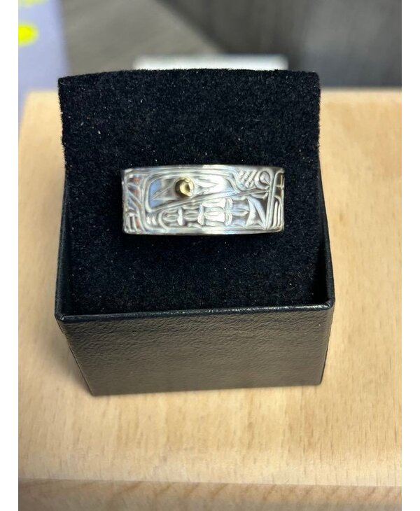 Hand Carved Silver Ring Solid Band with Gold eye s13.5 Wolf by Richard Lang
