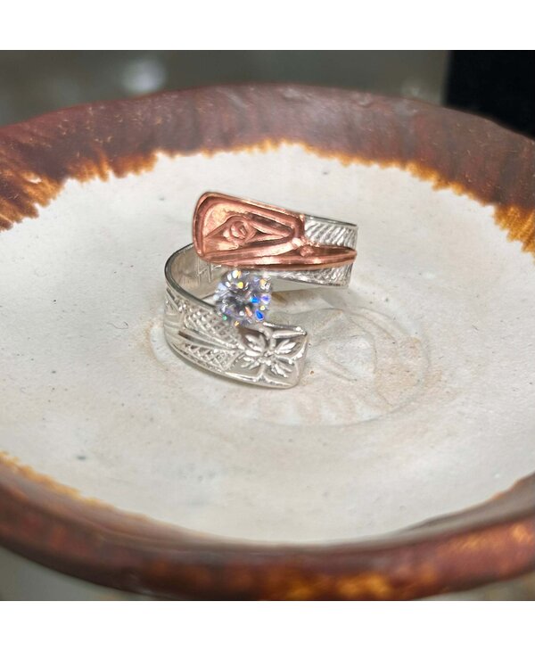 Hand Carved Wrap Ring with Copper Hummingbird CZ stone s9 by Richard Lang - Stó∶lō Gift Shop