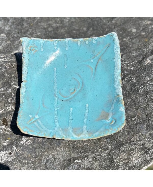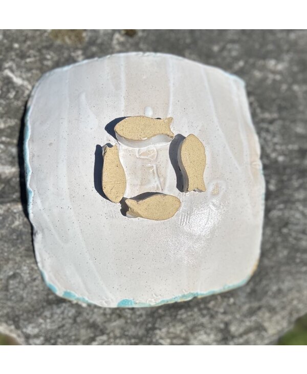 This "fishy" footed platter measures 6.5"x7.25" in a glacier glaze.