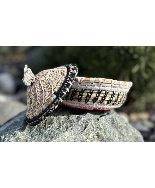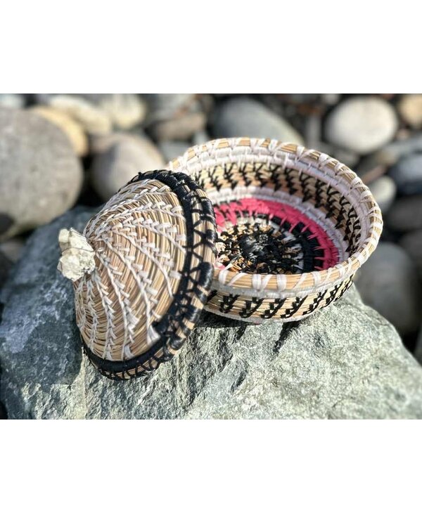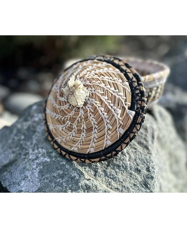Handmade Pine Needle Basket Black and White with Lid by Deanna Wium - Stó∶lō Gift Shop