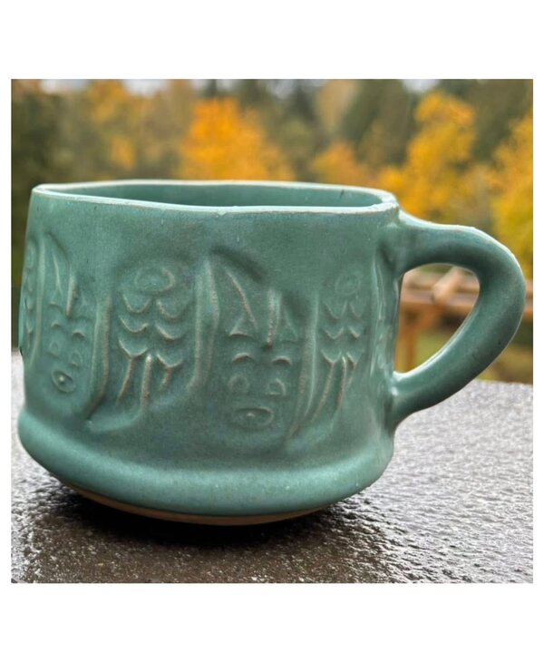 Handmade Pottery by Cynthia Robinson - Green Mug with Eagle Feathers
