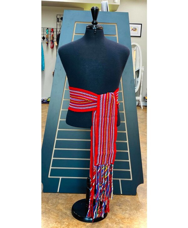 The distinct Red Voyageur Sash pattern is easily recognized as Métis. It has been a symbol of the Métis since the time of the fur traders. Today, sashes are worn as a symbol of pride and celebration, but during the fur trade, a sash was daily worn for the Métis. Men often wore their sashes folded in half and tied around the waist creating a pocket for tobacco, medicines, and fire starters. The sash had many practical uses; often worn as a belt for tying a Capote closed, or used as a washcloth and towel, or thread for sewing. The sash was also commonly used as a rope or as back support while carrying furs.