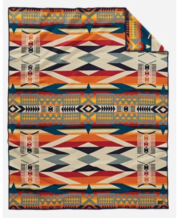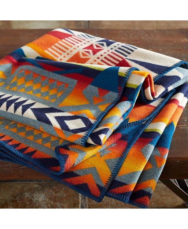 A made-in-America wool blanket in a dazzling geo pattern. It's based on a Native American legend that says a hero disguised himself as a rabbit to capture fire for his people, a victory honored in this vivid design. Reverses to pattern's opposite.