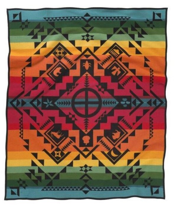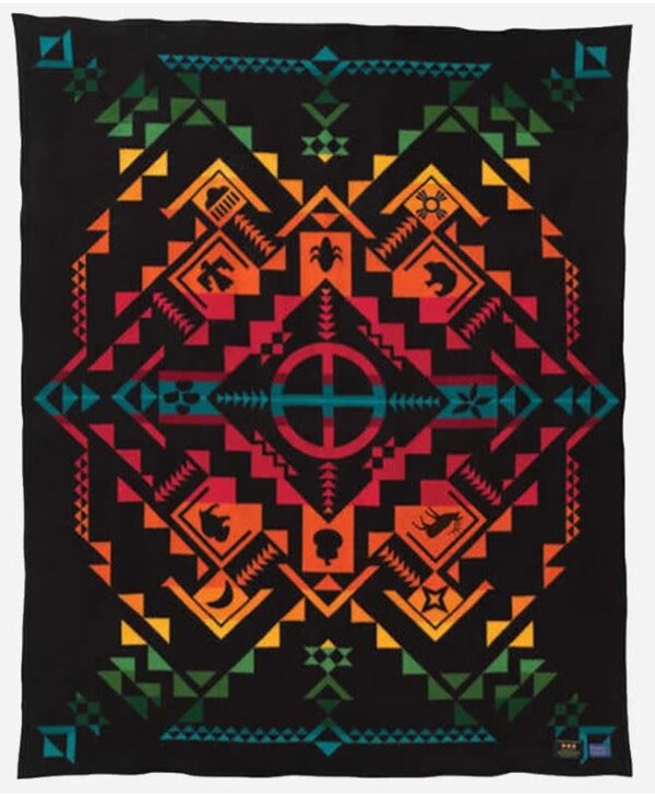 This design celebrates the commonalities of all Indigenous tribes. The sun, moon, stars and rain clouds represent an honoured relationship with the spiritual world of the cosmos. Reverence for the natural world is represented by both flora (corn, squash, beans and tobacco) and fauna buffalo, elk, bear and eagle). The dynamic central image is a sacred circle filled with a cross, a universal symbol of the origin of humankind and the four directions that guide us on our journey through life.