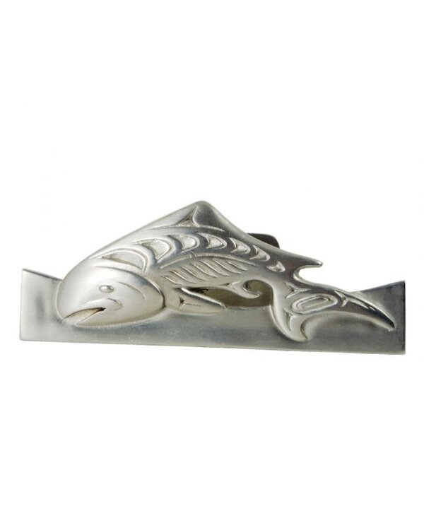 Native Salmon Business Card Holder, material Pewter. Made in Canada