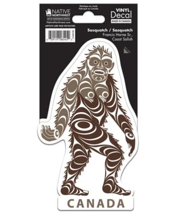 Sasquatch decal by Francis Horne, Sr. Coast Salish. Great for use on cars, snowboards, windows, and more, this Premium Decal measures approximately 4.5 in x 6.5 in with peel away backing.