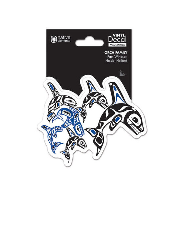 Orca Family decal by Paul Windsor, Haisla, Heiltsuk. Great for use on cars, snowboards, windows, and more, this Premium Decal measures approximately 4.5 in x 6.5 in with peel away backing.