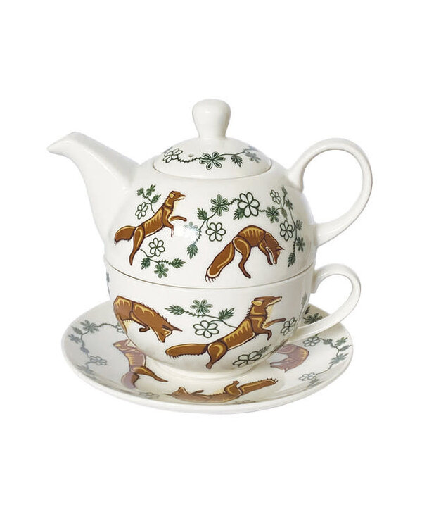 Beautiful ceramic tea set featuring one-of-a-kind Indigenous art. Each set features one 13oz teapot, an 8.5oz teacup, and a 6" saucer. The mug and teapot nest neatly together for easy storage. Each set comes in a coloured box, perfect for easy gift-giving