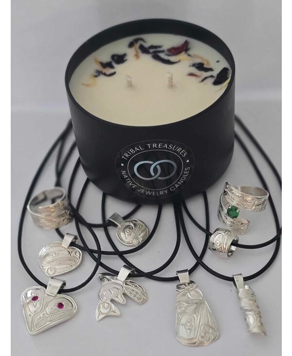 Scented soy candles infused with a hand carved, sterling silver native jewelry surprise.