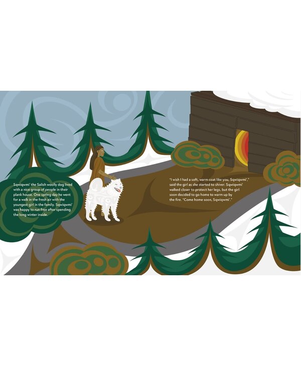 Sqwiqwmi’ the young Salish woolly dog has a nice warm coat, and he wants to help protect his people from the cold and wet West Coast winters too. He sets out to pick the cozy fluff that grows on the nearby fireweed, but the plants are bare this time of year. Guided by a friendly shrew and a wise eagle, Sqwiqwmi’ journeys across the Salish Sea and into high mountains, collecting goat's wool and nettle stalks—and even some of his own fur!—that his family will spin and weave into beautiful, warm blankets.